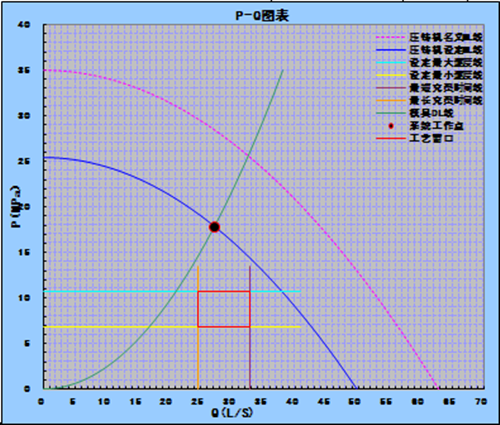 圖7:壓鑄工藝窗口示意圖 三、P-Q圖的設備線、模具線和壓鑄工藝窗口三者結合運用 P-Q圖技術是從能量守恒角度,通過壓力P和流量Q聯系起來分析壓鑄機、模具、鑄件之間的關系。壓鑄機為能量輸出端,模具為能量需求端,鑄件為壓鑄機和模具兩者共同作用的結果。當壓鑄機輸出能量和模具需求能量相符時,可得到理想的鑄件。反之質量難以保證。 1、合理的P-Q圖 當壓鑄機輸出的能量和模具需求的能量相符時,即P-Q圖的設備線和模具線的交點在壓鑄工藝窗口內部位置,見圖8,視為合理。