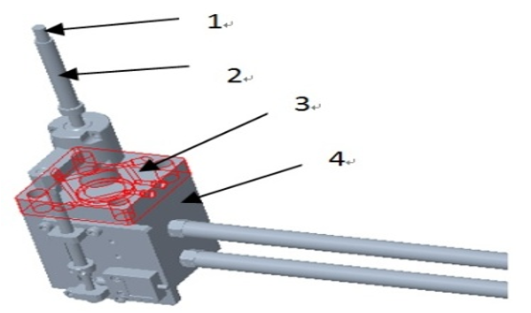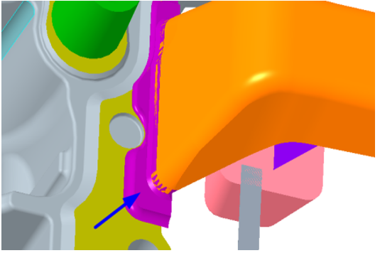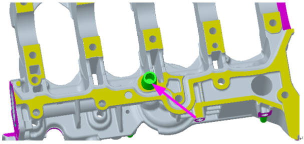 圖8:鑄鐵鑲嵌件安裝示意圖 5個鑄鐵鑲嵌件與鋁合金不能分離[1]。模具鑲塊噴涂后的溫度在150℃~200℃之間,鑄鐵鑲嵌件通過使用電熱箱提前加熱至230 ℃。經(jīng)機械手自動化安裝,模具合模等過程,壓射時鑄鐵鑲嵌件的溫度與模具溫度基本一致,解決了鑄鐵鑲嵌件與鋁合金由于溫差產(chǎn)生分離的問題,同時提高了壓鑄過程鋁液的流動性。 四、高壓油道孔Ⅰ位置的擠壓銷設(shè)計 高壓油道孔Ⅰ為斜孔,壓鑄不預(yù)鑄孔,孔由后期加工出。此處鑄件壁厚達22 mm以上,容易產(chǎn)生縮孔。為最大限度消除缺陷,在高壓油道孔Ⅰ的定模側(cè)設(shè)計擠壓結(jié)構(gòu)。設(shè)計的擠壓銷直徑為Φ12 mm,擠壓行程為20 mm, 擠壓方式為擠面。此種擠壓形式是在鑄件成型表面進行加壓作用,鑄件被加壓的部位比實際高度高出一定距離,以免把鑄件表面層冷料擠入鑄件內(nèi)部。擠壓后鑄件會產(chǎn)生一個圓環(huán),見圖9,通過后期加工去除。設(shè)計的擠壓油缸為缸徑Φ80mm的四方油缸。由于油缸安裝于定模套板內(nèi),安裝空間封閉,不利于散熱冷卻。油缸密封圈容易受過高溫影響失效,影響生產(chǎn)的連續(xù)性。在油缸前端安裝面設(shè)計運水冷卻板以降低溫度。擠壓結(jié)構(gòu)見圖10。