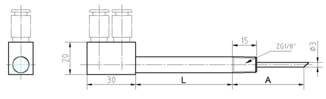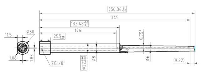 圖10:擠壓結(jié)構(gòu)示意圖 五、高壓油道孔Ⅱ型芯設(shè)計 由于橫向正對入料口,高壓油道孔Ⅱ型芯受鋁液高速沖擊,容易變形折斷,受鋁液高溫影響,鑄件容易出現(xiàn)扣傷、燒傷等缺陷。型芯設(shè)計采用YXR33/W360高韌性材料,表面進行Dura-AR電漿處理,熱處理后硬度(HRC)為52~54,表面處理后硬度(HV)為3600,提高了型芯的耐沖擊能力。型芯內(nèi)部設(shè)計Φ6mm超點冷孔(見圖11),設(shè)置了內(nèi)徑只有Φ3mm的不銹鋼點冷管的超點冷(見圖12)。增加高壓冷卻設(shè)備,型芯的內(nèi)部高壓冷卻水壓力達到1.5 MPa。為增強冷卻效果,避免受其他超點冷影響,設(shè)計了一個獨立水座,單獨連接高壓油道孔Ⅱ型芯的超點冷。