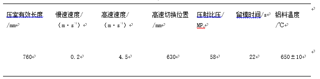 圖12:高壓超點冷 六、試制驗證 該鑄件全投影面積為193 515mm2,使用宇部16 500 kN壓鑄機生產(chǎn),壓射沖頭直徑為Φ130 mm。根據(jù)設(shè)計的模具參數(shù)以及零件的特點,制定了壓鑄試制的工藝參數(shù),見表1。