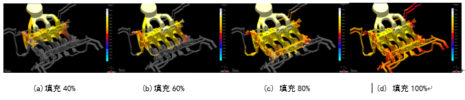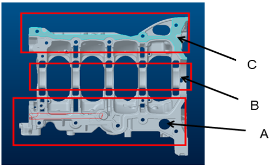 圖4:定模側(cè)與動模側(cè)充型過程模擬 由圖4模擬結(jié)果可以看出,進料口先填充產(chǎn)品動模側(cè),再向水尾填充,且整體填充比較順暢,沒有發(fā)現(xiàn)明顯紊流,符合設(shè)計的目的。 溢流排氣系統(tǒng)設(shè)計 根據(jù)圖4的進料模擬結(jié)果,在鋁料的最后填充位置或鋁料交匯位置設(shè)計溢流槽。圖5為下缸體結(jié)構(gòu)特點,可以看出,A和C區(qū)域為厚大部位,集中了產(chǎn)品的絕大部分鋁料,B區(qū)域為薄壁位置,安裝了鑄鐵鑲嵌件后的鋁料壁厚最薄處只有2 mm,形成5條狹長過料通道。 A區(qū)域的排氣和C區(qū)域的填充十分困難,也容易產(chǎn)生卷氣。溢流排氣系統(tǒng)設(shè)計見圖6,4個區(qū)域的末端各連接一個齒形激冷排氣塊。齒形激冷排氣塊集渣效果良好,配合真空機的使用可以解決厚度差異大而帶來的流動性不足問題。在各個區(qū)域的氣體能順暢排出的情況下,一方面有利于降低產(chǎn)品內(nèi)部氣孔,另一方面減少模具的負壓,有利于鋁料填充。澆注系統(tǒng)的模擬結(jié)果見圖7,可以看出,產(chǎn)品的各個部位填充和排氣較順暢,符合設(shè)計目的。
