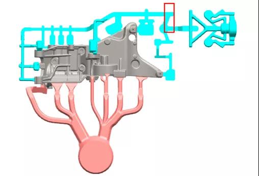 圖4:機油冷卻器支架澆排對策方案 模擬仿真驗證 通過在排氣道尾端增加減速結構,利用Anycasting軟件對增加減速結構的澆排進行模擬分析,本次模擬與原方案劃分網格相同,工藝參數設置相同,對鋁液的速度進行測量分析,檢測鋁液到達真空閥的速度約為29 m/s,見圖5。通過在排氣道尾端增加減速結構,能夠削弱鋁液對真空閥的撞擊速度,減小沖擊力,能夠消除真空閥堵塞問題及閥芯斷裂問題。
