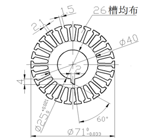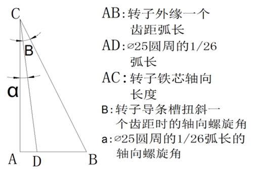 扭斜鍵螺旋角計(jì)算(圖3) 開口槽轉(zhuǎn)子因氣隙不均勻?qū)е抡麄€(gè)圓周范圍氣隙磁阻不均勻(槽部磁阻相對齒部大),使反電勢中含有齒槽諧波。當(dāng)轉(zhuǎn)子采取斜槽后,能有效遏制齒槽諧波磁場所產(chǎn)生的附加轉(zhuǎn)矩,使電磁振動和噪聲獲得降低。轉(zhuǎn)子鐵芯扭斜角度是否到位將直接影響到克服反電勢中齒槽諧波的效果,因此,必須在轉(zhuǎn)子壓鑄前尋求一種快速、高效的鐵芯斜槽方法。
