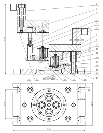 圖7:轉(zhuǎn)子壓鑄模 圖7是設(shè)計(jì)在ZJ40-400 kN型全立式壓鑄機(jī)工作的壓鑄模具,因采用瓣合式定位圈,獲得了一模四件的高效率且安裝鐵芯嵌件平穩(wěn)、速度快捷;為獲得良好的填充效果和產(chǎn)品外觀,克服斷條弊病,采用了點(diǎn)澆口進(jìn)料方式,為了便于從壓鑄模內(nèi)取出壓鑄件和保證壓鑄件表面不被拉傷,設(shè)置端環(huán)脫模斜度為1.5~3o,并因采用了兼?zhèn)渥詣訑酀部诘男读习鍣C(jī)構(gòu),極大降低了勞動強(qiáng)度。