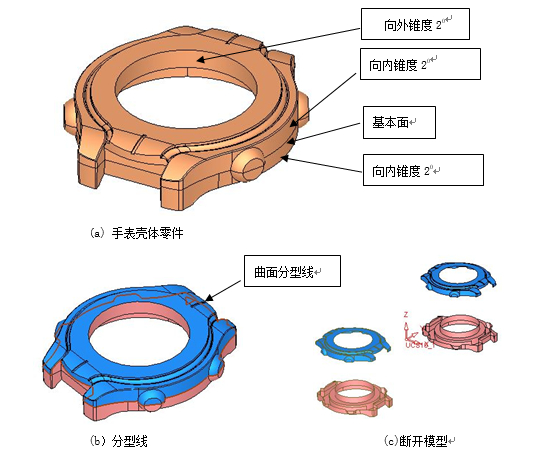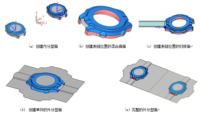 圖1:手表外殼零件及快速斷開模型 圖2為創建分型面的過程。以圖1中曲線為基準設計成曲面分型線,將這條曲面分型線設計成分型面,這樣形成曲面式分型,避免使用側抽芯機構,而表鏈位置既有斜面又有曲面,可通過分步補曲面來完成。用封閉孤島的功能把中心孔創建成內分型面,見圖2a。沿著分型面的輪廓在表鏈位置創建一個混合曲面,見圖2b,再以該曲面的外側輪廓創建組合曲線,并以此曲線創建掃掠面,見圖2c,通過鏡像可得到另一側掃掠面,見圖2d。以掃掠面外側輪廓和殼體其他輪廓創建組合曲線,以此曲線創建掃掠面,通過鏡像把已創建的腔殼體分型面鏡像到另一腔,然后用ZX平面裁減外分型面,完成分型面零件的設計,見圖2e,這些曲面歸集在分型面零件中,用于后續模具成形零件的設計。