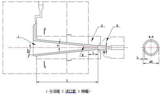 式中,GF=0.31c㎡代入式(3),可得直澆道截面積直F=0.37c㎡。 2、澆口套和分流錐設計