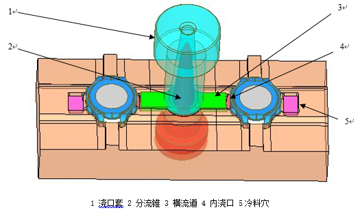 圖3:設計型腔和型芯零件 二、澆注系統的設計 澆注系統尺寸隨著鑄件材質、結構及具體生產條件的不同而變化。由于鑄件厚度不均勻,會出現排氣困難和浮渣殘存缺陷,采用兩側澆注式結構,實現順序凝固和避免產生縮孔。為了避免合金液沖刷直澆道底部,降低金屬液的流速及改變流向,直澆道采用流錐和分流錐配合。澆注系統的計算取決于最小截面積,可根據比例確定其他截面積。 1、內澆口設計 (1)內澆口截面積計算