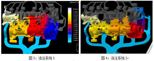 圖2:缸蓋罩殼體的凝固分析 凝固模擬發現缸蓋罩主要的熱節集中在螺栓過孔。針對容易產生縮孔的位置,采取調整該處位置內澆口鋁液的流量與角度。基于鑄件結構,設計了2種澆注系統。方案1(見圖3)采用水平推進的方式布置澆口,并且在熱節位置增加渣包。從充型模擬結果看,整個鑄件充型較為穩定,但在雙油封孔位置存在流速過慢和包卷的現象;方案2是在方案1的基礎上進行了改進(見圖4),方案2可以較好的改善雙油封孔位置的填充,并且消除了鋁液在該位置流態的包卷,整個填充流態較為平穩。針對方案2,對鑄件進行了氣壓分析、填充溫度分析、填充速度分析,見圖5。