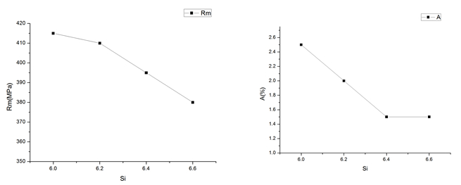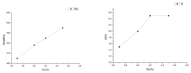 圖1:不同Si含量對合金力學(xué)性能的影響(熱處理狀態(tài)T6處理) 圖2是Cu含量分別在3.7%、4.0%、4.2%以及4.5%時合金的力學(xué)性能??梢钥闯觯S著Cu含量提高,合金抗拉強度以及伸長率都有不同程度的增加。由于合金中Cu含量提高會增加合金的熱裂敏感性,而轉(zhuǎn)向節(jié)鑄件結(jié)構(gòu)較為復(fù)雜,且采用擠壓鑄造工藝,如采用Cu含量較高的合金成分,極易出現(xiàn)熱裂缺陷,因此,將合金的Cu含量設(shè)定為成分范圍的下線,即Cu含量為3.7%。