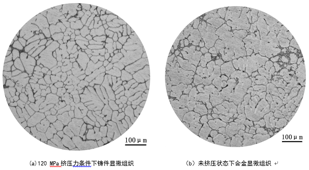 表1:轉(zhuǎn)向節(jié)鑄件不同位置力學(xué)性能平均值 從表1可以看出,鑄件本體力學(xué)性能有了較為顯著的提升,特別是伸長率提高較為明顯。主要原因是,隨著壓力的提升顯著提高了合金液的形核率,由于形核率與壓力呈正比關(guān)系,壓力的增加可顯著促進晶核的增殖,使晶粒變小,細化了鑄件晶粒組織。另外,擠壓力的增加可改善鑄件與模具之間的界面?zhèn)鳠釛l件,熱阻顯著降低,提高合金液的凝固速率,減小鑄件一次枝晶間距和二次枝晶間距,鑄件晶粒組織得到明顯細化,從而使鑄件力學(xué)性能得到顯著提升。另外,擠壓力的存在可增加ɑ固溶體的數(shù)量以及細化硅質(zhì)點,從而顯著提高合金的塑性性能。圖9為擠壓狀態(tài)和未擠壓狀態(tài)合金的顯微組織,可以看出,經(jīng)過擠壓后鑄件顯微組織明顯細化。