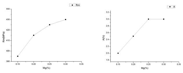圖2:不同Cu含量對合金力學(xué)性能的影響 圖3是Mg含量分別在0.15%、0.2%、0.25%以及0.3%時合金的力學(xué)性能??梢钥闯觯S著Mg含量提高,合金抗拉強度和伸長率都有不同程度的增加。由于Mg元素在合金熔煉過程中容易燒損,因此,為保證Mg元素符合該合金成分范圍,將合金的Mg含量設(shè)定為成分范圍的上線,即Mg含量為0.3%。 基于此,確定了試驗用合金的化學(xué)成分,即6.0%的Si,3.7%的Cu,0.30%的Mg,0.05%~0.30%的Ti,其余為Al。