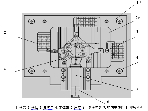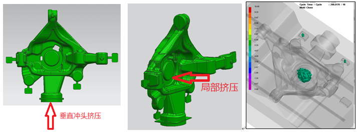 圖4:轉(zhuǎn)向節(jié)鑄件擠壓鑄造工藝 3.轉(zhuǎn)向節(jié)鑄件擠壓鑄造模具設(shè)計 間接擠壓鑄造工藝是目前主流的擠壓鑄造成形工藝,該工藝可實現(xiàn)合模成形、滿足結(jié)構(gòu)復(fù)雜鑄件成形的需要,且尺寸精度高,可滿足近凈成形的要求。為了保證轉(zhuǎn)向節(jié)鑄件的尺寸精度,采用了間接擠壓鑄造成形工藝,并設(shè)計了轉(zhuǎn)向節(jié)擠壓鑄造成形模具(見圖5)。該模具的主要工作過程是:首先,臥式擠壓機動模板帶動動模運動,與定模閉合完成鎖模動作;之后,將金屬液澆入到壓室之中,臥式擠壓鑄造機擠壓缸帶動擠壓活塞向上運動,推動金屬液向上充型,當(dāng)金屬液完成充型之后,保壓一段時間使金屬液在壓力下完成凝固,保壓結(jié)束后,動模帶動鑄件移動完成開模過程,當(dāng)移動到一定距離之后觸碰到頂桿機構(gòu),完成轉(zhuǎn)向節(jié)鑄件脫模過程;最后,移出轉(zhuǎn)向節(jié)鑄件,向定模和動模型腔噴涂脫模機,完成整個工藝過程。