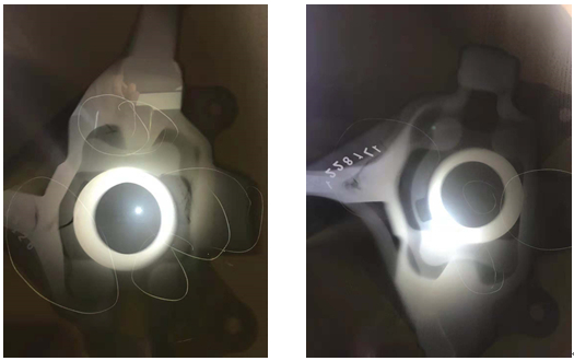 圖5:轉(zhuǎn)向節(jié)鑄件擠壓鑄造模具結(jié)構(gòu)示意圖 4.轉(zhuǎn)向節(jié)鑄件試制結(jié)果與分析 4.1 擠壓力對鑄件內(nèi)部質(zhì)量的影響 圖6是擠壓力為60 MPa條件下,轉(zhuǎn)向節(jié)鑄件無損探傷檢測情況??梢钥闯觯D(zhuǎn)向節(jié)鑄件存在較為嚴(yán)重的縮孔、縮松缺陷,特別是厚壁位置,以及遠離擠壓沖頭和局部擠壓沖頭位置缺陷更加嚴(yán)重。分析認(rèn)為,在擠壓鑄造加壓過程中,由于沖頭的加壓過程與鑄件凝固過程同時進行,鑄件薄壁位置凝固較快,會成為一個“支撐點”,從而阻礙沖頭對尚未凝固的厚大部位進一步擠壓,該部位得不到補縮而出現(xiàn)縮孔、縮松缺陷。另外,在間接擠壓鑄造過程中,由于已凝固的結(jié)晶硬殼與鑄型壁之間存在“摩擦力”,加之此硬殼的“支撐”作用,以及復(fù)雜結(jié)構(gòu)對補縮液態(tài)金屬流的“阻礙”作用,使遠離沖頭和局部擠壓的鑄件部位實際上受到的擠壓壓力遠低于工藝設(shè)定的擠壓力,存在較大的“壓力損失”,導(dǎo)致鑄件一些部位生產(chǎn)較為嚴(yán)重的冶金缺陷問題。 為了解決上述問題,將擠壓力提高了1倍,即達到120 MPa,圖7是轉(zhuǎn)向節(jié)鑄件在擠壓力為120 MPa條件下無損探傷結(jié)果。可以看出,鑄件內(nèi)部質(zhì)量良好,未發(fā)現(xiàn)鑄造冶金缺陷問題。分析認(rèn)為,擠壓力的增加克服了薄壁位置率先凝固而產(chǎn)生的“支撐阻礙”作用以及遠離沖頭而造成的“壓力損失”,達到了可消除鑄件冶金缺陷問題的“臨界擠壓值”,顯著提高了液態(tài)金屬的補縮能力,消除了鑄件產(chǎn)生的冶金缺陷。