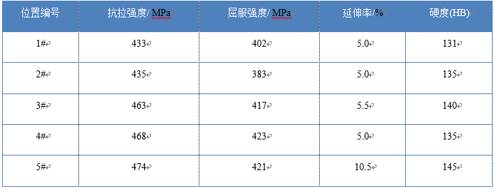 圖7:擠壓比壓為120 MPa條件下轉(zhuǎn)向節(jié)鑄件X光探傷片 4.2 擠壓力對鑄件本體力學(xué)性能的影響 對轉(zhuǎn)向節(jié)鑄件本體力學(xué)性能進行測試,圖8為本體力學(xué)試棒取樣位置,表1為鑄件各部位本體力學(xué)性能。從力學(xué)性能測試結(jié)果上看,鑄件各個位置力學(xué)性能相當(dāng),說明擠壓效果良好,壓力損失并不明顯。
