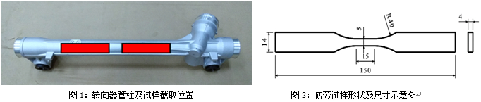 表2:鑄造鋁合金AlSi9Cu3的力學性能 疲勞試樣從某轉向器管柱經過線切割得到,轉向器管柱以及試樣截取位置見圖1,試樣形狀及相關尺寸見圖2。為了消除試樣試驗區的機械加工痕跡,得到光滑試樣,采用400、800、1000、2000號砂紙對試驗區進行打磨拋光,并對試樣的棱角邊進行磨圓處理。
