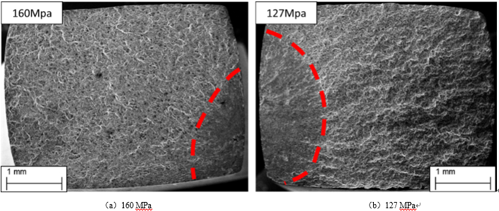 在裂紋穩定擴展階段,試樣斷口表面最重要的顯微特征是“疲勞條帶”,見圖5。疲勞條帶是一系列基本上相互平行的條紋,其與局部裂紋擴展方向垂直。隨著裂紋的進一步擴展,試樣可承載面積逐漸減小。當裂紋擴展到臨界尺寸時,試樣突然斷裂形成瞬斷區,瞬斷區比較粗糙,與材料靜態破壞斷口形貌相似。與低應力水平相比,試樣承受高應力水平時,疲勞擴展區面積較小,瞬斷區面積較大,見圖6。