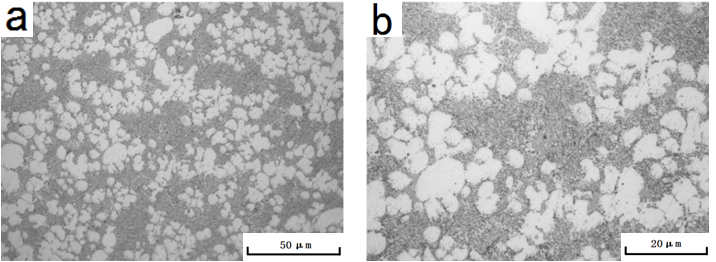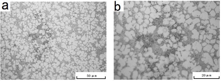 圖7:位置4鑄態(tài)金相組織顯微圖 從圖7中未見明顯卷氣及氧化夾雜等缺陷,但可看出共晶組織分布比較集中,該區(qū)域存在一定程度的偏析現(xiàn)象,共晶組織的富集會(huì)導(dǎo)致局部的抗腐蝕能力降低。這是因?yàn)樵谌蹮掃^程中,金屬液成分不均,即熔體攪拌不均勻,使得該處金相試樣抗腐蝕性能較差,易出現(xiàn)腐蝕現(xiàn)象。共晶組織形成的微觀偏析同樣也會(huì)導(dǎo)致鑄態(tài)合金的力學(xué)性能下降。