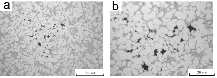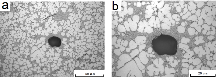 圖6:位置3含有縮孔鑄態(tài)金相組織顯微圖 從圖6可觀察到較為突出的縮孔現(xiàn)象。白色基體是α-Al固溶體,不均勻的共晶組織呈顆粒狀分布在α--Al基體上,從高倍組織觀察到該區(qū)域存在縮孔缺陷,其一般在鑄件中心最后凝固的部分,是因?yàn)樵鰤翰患皶r(shí)造成鋁液補(bǔ)縮不充分,縮孔會(huì)導(dǎo)致鑄件的力學(xué)性能下降,并會(huì)在零件受到應(yīng)力時(shí)成為裂紋源,導(dǎo)致零件斷裂。