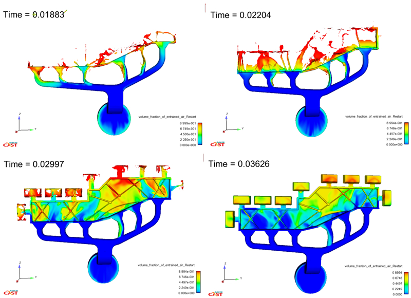 圖2:充型過程數(shù)值模擬結(jié)果 預(yù)先對坩堝進(jìn)行預(yù)熱,裝料完成后,將爐溫控制在680 ℃以上。當(dāng)爐料完全熔化后,停止加熱,待金屬液降到660 ℃左右時(shí)加入純Mg塊,隨后再次加熱,將爐溫調(diào)至680 ℃以上,進(jìn)行精煉除氣扒渣,隨后調(diào)整合金液溫度至670 ℃左右,靜置5 min。依據(jù)模擬結(jié)果可知,對該鑄件最佳的工藝參數(shù)是快壓射速度為2 m/s,模具溫度為135 ℃,填充溫度為740 ℃,以此進(jìn)行試生產(chǎn)。根據(jù)Flwo-3D仿真模擬結(jié)果,在試樣上確定特征較為突出的位置,并進(jìn)行切割取樣,觀察其微觀組織形貌,取樣位置見圖3。