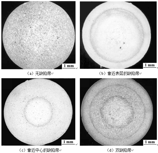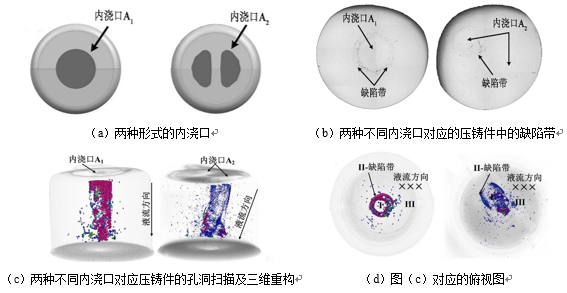 圖6:基于膨脹剪切理論的缺陷帶形成機理示意圖 到目前為止,研究者們并不能系統(tǒng)地解釋為何壓鑄件中有時觀察不到缺陷帶,而有時是單缺陷帶,有時又是雙缺陷帶甚至多缺陷帶,或者不規(guī)則的缺陷帶。基于已有研究,認為缺陷帶的形成受壓鑄過程壓室預結(jié)晶及金屬液流形態(tài)的影響,應當從熔體充填形態(tài)、凝固順序、充型及凝固切應力、糊狀區(qū)力學特性及補縮機制等方面綜合進行考慮。首先,缺陷帶是冷室壓鑄工藝特有的組織現(xiàn)象,可以推斷出缺陷帶的形成必然與預結(jié)晶顆粒或者半固態(tài)糊狀區(qū)有關。其次,缺陷帶的形成受壓鑄過程金屬液流形態(tài)影響,見圖7:壓鑄過程中拉伸圓棒壓鑄件端面分別設置兩種形式的內(nèi)澆口,通過金相觀察及孔洞掃描可以看到壓鑄件中缺陷帶的形成位置及分布分別與內(nèi)澆口及液流方向相對應。