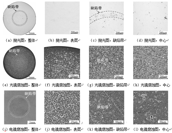 圖1:鎂合金壓鑄件橫截面不同形貌及分布特征的缺陷帶 采用不同的組織觀察方法對鎂合金壓鑄件橫截面的顯微組織進行分析,見圖2。可以看到壓鑄鎂合金組織從宏觀上可以分為3個部分,第一部分是從壓鑄件表層到缺陷帶外表面的組織,其特點是孔洞較少,ESCs組織大多為破碎的枝晶,沒有聚集現(xiàn)象,因此組織較為致密;第二部分是距離壓鑄件表層一定距離的缺陷帶,在其內(nèi)部富集大量形貌不規(guī)則的孔洞,ESCs組織相較于周圍ESCs細小,從電鏡圖片中可以看出,缺陷帶中的孔洞主要分布在晶界(ESCs或α-Mg)處;第三部分是缺陷帶所包圍的心部組織,尺寸較大的ESCs組織增多,且在心部大量聚集,在ESCs聚集的晶界處有大量的疏松存在,因此含有較多孔洞,但分布較為隨機。