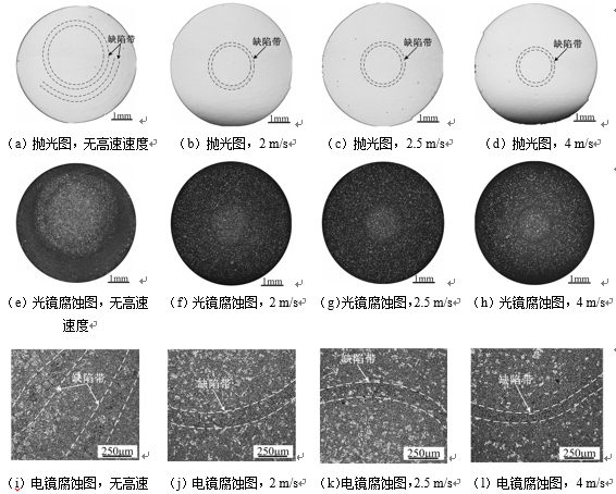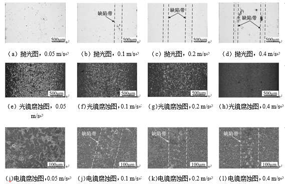 圖3:不同低速速度下的壓鑄鎂合金缺陷帶組織形態(tài) 壓鑄鎂合金缺陷帶形貌及分布特征隨高速速度的變化見圖4。可以看到,隨著高速速度提高,壓鑄件中ESCs組織分布愈加彌散,形貌趨于球狀,而在心部ESCs組織明顯要多于其他部位。而隨著高速速度增加,缺陷帶愈加靠近中心,缺陷帶寬度減小,內(nèi)部孔洞更加集中。在無高速速度的情況下,壓鑄件中出現(xiàn)雙缺陷帶現(xiàn)象,靠近壓鑄件表面的缺陷帶寬度較寬,且其外部幾乎不含有ESCs,而靠近內(nèi)部的缺陷帶寬度較窄,在其內(nèi)外兩側(cè)均有大量的ESCs聚集。