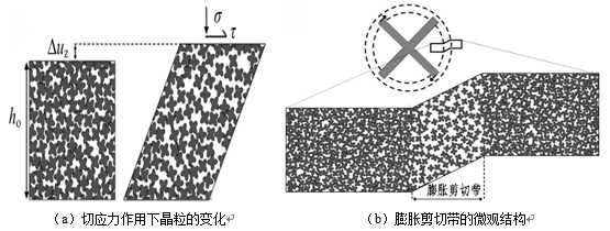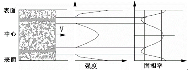 圖5:基于壓室預結(jié)晶理論的缺陷帶形成機理示意圖 有研究認為缺陷帶為膨脹剪切帶,其形成是由于具有一定固相分數(shù)的金屬液所表現(xiàn)出的類似顆粒材料在剪切變形過程中的流變特性,見圖6。凝固過程中含一定固相分數(shù)的金屬液相當于壓實的顆粒材料,在切應力的作用下會相互推擠發(fā)生膨脹造成局部變形,并集中在剪切帶處最終達到一個臨界狀態(tài)。液態(tài)金屬由于壓差被引至膨脹剪切帶內(nèi),隨著凝固進行,帶狀區(qū)域的金屬液對鄰近區(qū)域的凝固收縮進行補縮,而在凝固后期帶狀區(qū)域自身的凝固收縮不能得到有效的補縮,因此在帶狀區(qū)域形成了集中的縮孔縮松。將膨脹剪切理論應用于鎂合金冷室壓鑄工藝,可以一定程度上解釋雙缺陷帶的形成機理。在壓鑄充型過程中,由于激冷作用,壓鑄件表層會產(chǎn)生一層凝固殼層,在高速充填型腔時金屬液流在靠近凝固殼層區(qū)域會產(chǎn)生較大的切應力,而該區(qū)域呈半固態(tài),在切應力的作用下晶粒會發(fā)生運動而產(chǎn)生相應的間隙,最后由于補縮困難而產(chǎn)生靠近表層的缺陷帶組織。在凝固過程中,由于增壓壓力會導致切應力的存在,其作用在半凝固態(tài)的晶粒上會引起晶粒的相對運動,并產(chǎn)生相應的間隙,而最后由于補縮困難,產(chǎn)生靠近壓鑄件中心的缺陷帶組織。