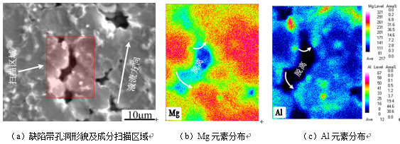 圖7:金屬液流形態(tài)對壓鑄鎂合金缺陷帶形成的影響 采用電子背散射衍射(EBSD)對鎂合金壓鑄件不同部位的晶粒取向進行分析,發(fā)現(xiàn)壓鑄件表層α-Mg晶粒及心部完整ESCs枝晶未發(fā)現(xiàn)孿晶現(xiàn)象,而在心部破碎ESCs晶粒及缺陷帶內(nèi)部ESCs晶粒中,出現(xiàn)大量的孿晶現(xiàn)象。分析其原因,壓鑄件表層α-Mg晶粒在型腔中形核長大,幾乎沒有外力作用在α-Mg晶粒上;而ESCs顆粒形核于壓室中,并隨著沖頭的壓射過程通過內(nèi)澆口進入型腔。由于壓鑄充型過程高速高壓的特點,ESCs顆粒在進入型腔過程中會經(jīng)受液流的沖刷以及后續(xù)的增壓壓力作用,導致部分ESCs晶粒發(fā)生旋轉(zhuǎn)破碎,最終破碎的ESCs晶粒內(nèi)部會產(chǎn)生殘余應力形成孿晶現(xiàn)象,而未經(jīng)受金屬液流沖刷及增壓壓力作用的ESCs枝晶,則完整無缺且沒有出現(xiàn)孿晶現(xiàn)象。由缺陷帶內(nèi)部ESCs晶粒出現(xiàn)大量的孿晶現(xiàn)象,說明在缺陷帶處有較大的應力存在,也即可以推斷缺陷帶的形成與充型過程中金屬液流沖刷所產(chǎn)生的應力以及后續(xù)的增壓壓力有關。 對缺陷帶內(nèi)部孔洞周圍組織的化學成分分布進行分析,見圖8,發(fā)現(xiàn)孔洞周圍組織的Mg及Al元素分布輪廓一致,可完美的拼接,且Al元素在孔洞周圍有少量富集的現(xiàn)象。可以推斷,在壓鑄過程中由于高速高壓金屬液的劇烈沖刷作用以及后續(xù)的增壓壓力作用,處于半固態(tài)糊狀區(qū)的ESCs及α-Mg晶粒破碎或進行轉(zhuǎn)動,在晶粒間形成大于剩余金屬液體積的間隙,隨著凝固過程進行,由于補縮困難形成沿液流輪廓分布孔洞聚集的缺陷帶組織。