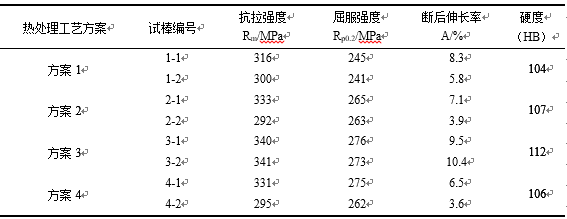 圖7:不同熱處理方案下擠壓鑄造A356.2鋁合金顯微組織 2.2、力學(xué)性能 不同熱處理試樣的力學(xué)性能數(shù)據(jù)見表2。可以看出,經(jīng)4種固溶時效,A356.2鋁合金硬度變化不大,均超過100HB,滿足發(fā)動機懸置支架的硬度要求。經(jīng)方案1熱處理后,試樣的平均抗拉強度為308 MPa,屈服強度為243 MPa,斷后伸長率為7%,3項力學(xué)性能指標均不能滿足使用要求。經(jīng)方案2熱處理后,試樣的平均抗拉強度為312.5 MPa,屈服強度為264 MPa,斷后伸長率為5.5%,在此方案下,抗拉強度和屈服強度均超過使用規(guī)定值,但斷后伸長率不能滿足使用要求。方案3熱處理下,試樣的平均抗拉強度為340.5 MPa,屈服強度為274.5 MPa,斷后伸長率為10%。可見,試樣經(jīng)方案3熱處理后,試樣的3項力學(xué)性能指標均超過了使用規(guī)定值,其中抗拉強度超過30.5 MPa,屈服強度超過24.5 MPa,斷后伸長率超過25%。方案4熱處理下,試樣的平均抗拉強度為313 MPa,屈服強度為268.5 MPa,斷后伸長率為5%。在此方案下,試樣的抗拉強度和屈服強度超過使用規(guī)定值,但斷后伸長率不能滿足使用要求。