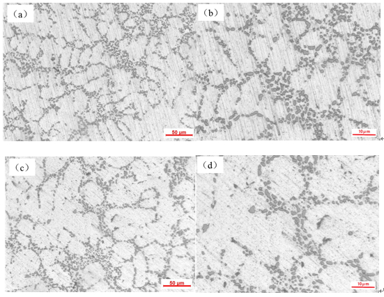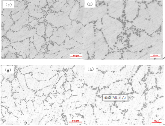 圖6:擠壓鑄造A356.2鋁合金鑄態(tài)顯微組織 圖7為擠壓鑄造A356.2鋁合金固溶時效處理后的顯微組織。圖7a、圖7b中橢圓形樹枝狀組織為α-Al基體,樹枝間隙為共晶組織(α+Si),其中灰色顆粒為共晶Si。對比鑄造組織可以發(fā)現(xiàn),經(jīng)固溶熱處理,共晶組織形態(tài)發(fā)生較大變化,是因為共晶組織中Si相部分固溶到α-Al相中,導(dǎo)致Si相含量減少。隨著固溶時間增加,α-Al相由橢圓形向圓形轉(zhuǎn)化,見圖7e、圖7g。從圖7b、圖7d可以看出,當固溶時間為4 h時,可視區(qū)內(nèi)共晶Si呈離散分布,且顆粒數(shù)量較多;從圖7f、圖7h可以看出,當固溶時間增加到6 h時,共晶Si數(shù)量減少,且共晶Si尺寸也有一定程度減小,而時效溫度提高到180 ℃時,共晶Si數(shù)量明顯減少,Si越來越孤立且長大粗化,由粒狀、球狀向片狀轉(zhuǎn)變。