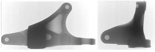 表2:不同熱處理方案下試樣的力學(xué)性能 從試驗結(jié)果看,在固溶溫度(535℃)不變時,固溶時間、時效溫度和時效時間對A356.2鋁合金的力學(xué)性能均有一定的影響。固溶時間過短,不利于Si、Mg元素在α-Al相中充分擴散與溶解,降低固溶強化效果;固溶時間過長,會導(dǎo)致α-Al相粗化,降低材料的力學(xué)性能。A356.2鋁合金的固溶時間取6 h比較合理。 鋁合金在時效處理中顯微組織發(fā)生了α-Al→G.P.區(qū)→β′相→β相的轉(zhuǎn)變過程,轉(zhuǎn)變過程中伴隨強化相β′的析出,β′相與α-Al基體保持半共格,使晶格發(fā)生嚴重畸變,而起到強化作用。如果β′相能充分彌散均勻析出,可使強化效果達到最佳。當時效過程進一步延長時,β′相將進一步轉(zhuǎn)化為穩(wěn)定的β相。β相與α-Al基體是非共格關(guān)系,對基體的強化作用較弱,如果在時效處理過程中,β相發(fā)生粗化,對基體的強化作用將更差。因此,時效處理時,需要合理設(shè)置時效溫度和時效時間,以控制強化相的析出。時效溫度和時效時間主要影響共晶硅顆粒以及強化相的形態(tài)和分布。方案4與方案3相比較,將時效溫度由170 ℃提高到180 ℃,試樣的力學(xué)性能均出現(xiàn)明顯下降,尤其伸長率降低50%。這是因為,時效溫度提高后,共晶Si出現(xiàn)一定程度的粗化,且顆粒圓度得不到保證,從而導(dǎo)致材料力學(xué)性能下降。 2.3、內(nèi)部缺陷 對懸置支架中可能存在的縮孔、縮松以及氣孔缺陷,采用X射線進行無損探傷檢測,檢測結(jié)果見圖8。可以看出,鑄件未發(fā)現(xiàn)明顯的黑點、顯微縮孔以及樹枝狀的暗區(qū),支架內(nèi)部品質(zhì)良好,縮孔、氣孔≤ASTM(美國材料與試驗協(xié)會)E115一級,滿足產(chǎn)品使用要求。試驗中,將內(nèi)澆口設(shè)置在發(fā)動機懸置支架壁厚最大的位置,且鋁合金液在沖頭作用下反重力充型,可以方便支架排氣、凝固補縮,對減少或消除支架中氣孔、縮孔、縮松等缺陷是有利的
