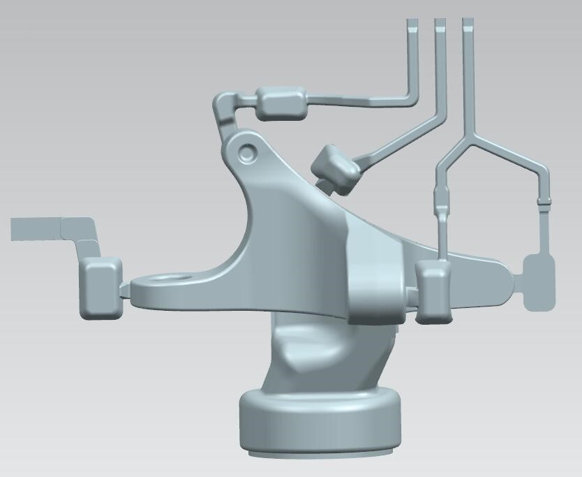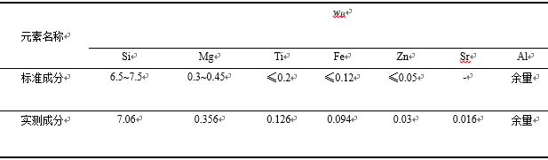 圖1:鋁合金發(fā)動機懸置支架實物圖 1.1、試驗材料和方法 試驗材料為A356.2鋁合金,其成分見表1。合金熔煉過程中需進行除氣、除渣和變質(zhì)處理。采用Sr變質(zhì)處理, Sr含量為0.01%~0.045%。試驗中選用宇部HVSC800PL臥式擠壓鑄造機,沖頭直徑為Φ125mm,將內(nèi)澆口設(shè)置在發(fā)動機懸置支架壁厚最大的位置,使金屬液在沖頭作用下反重力充型,見圖2。擠壓鑄造工藝參數(shù):擠壓比壓為100 MPa,澆注溫度為700 ℃,模具溫度為200 ℃,擠壓速度(沖頭運動速度)采用分段調(diào)速,即第一段沖頭速度設(shè)置為180 mm/s,第二段沖頭速度設(shè)置為80 mm/s,第三段沖頭速度設(shè)置為50 mm/s,保壓時間約為75 s。