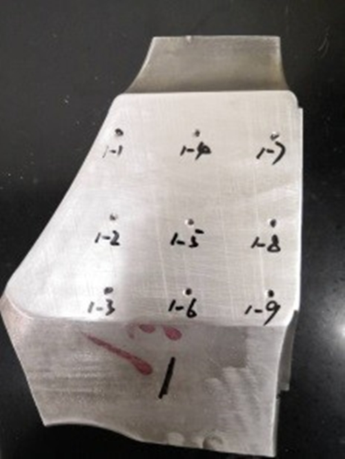 圖2:鑄件反重力充型示意圖 1.2、熱處理工藝 擠壓鑄造鋁合金懸置支架采用固溶時效熱處理。試驗選定了4種熱處理方案:方案①:535℃4 h固溶+155 ℃6 h時效+8 min水淬;方案②:535 ℃4 h固溶+160 ℃7 h時效+8 min水淬;方案③:535 ℃6 h固溶+ 170 ℃6 h時效+8 min水淬;方案④:535 ℃6 h固溶+180 ℃6 h時效+8 min水淬。 1.3、顯微組織分析及內(nèi)部缺陷觀察 顯微組織觀察試樣需經(jīng)過粗磨、細磨、拋光、腐蝕,腐蝕后的試樣用無水酒精清洗干凈,并用冷風(fēng)吹干。腐蝕劑為體積分數(shù)為2%的HF溶液。在Leica DFC295光學(xué)顯微鏡下觀察顯微組織形貌。固溶時效處理的懸置支架內(nèi)部采用X-射線無損探傷檢測,觀察其內(nèi)部縮松、縮孔、裂紋等缺陷。對懸置支架中可能存在的夾雜缺陷,采用顯微鏡對拉伸試棒斷口進行宏觀觀察。 1.4、力學(xué)性能測試 從熱處理后的支架中隨機選取試樣進行測試,在支架中間部位選取9個測試點,見圖3。硬度在HBE-300M布氏硬度計上測量,載荷為500 kN,加載時間為25 s,測量結(jié)果取平均值。在支架本體截取拉伸試棒進行力學(xué)性能測試,截取位置分別距離內(nèi)澆口15 mm與55 mm,見圖4。拉伸試棒見圖5。拉伸試驗采用三思UTM5105拉伸試驗機,載荷為100 kN,加載速度為1 mm/min。每種熱處理狀態(tài)下同一位置的拉伸試樣取2個,力學(xué)性能均取2次拉伸的平均值。