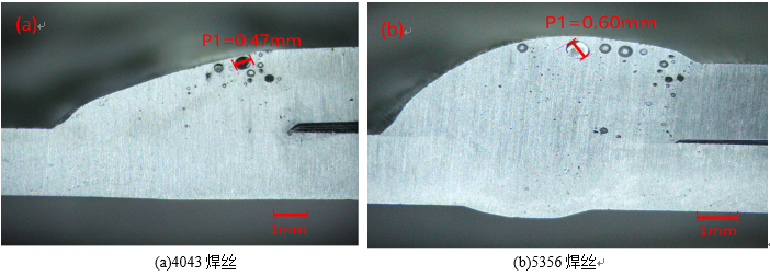 表3:真空壓鑄鋁合金減震塔(改善后)本體取樣力學(xué)性能 3.2 焊接性能檢測(cè) 對(duì)減震塔本體取樣進(jìn)行MIG焊接,焊絲采用ER4043和ER5356兩種焊絲,對(duì)焊接接頭進(jìn)行拉伸測(cè)試和宏觀金相觀察。焊縫接頭的力學(xué)性能檢測(cè)結(jié)果見(jiàn)表4。可見(jiàn),保留焊縫余高時(shí),采用ER4043焊絲的焊縫接頭的平均抗拉強(qiáng)度為150.93 MPa,接頭強(qiáng)度系數(shù)達(dá)到母材的69.82 %;采用ER5356焊絲的焊縫接頭的平均抗拉強(qiáng)度為163.91 MPa,接頭強(qiáng)度系數(shù)達(dá)到母材的75.82%;打磨掉焊縫余高時(shí),采用ER4043焊絲的焊縫接頭的平均抗拉強(qiáng)度為149.67 MPa,接頭強(qiáng)度系數(shù)達(dá)到母材的69.23%,采用ER5356焊絲的焊縫接頭的平均抗拉強(qiáng)度為164.67 MPa,接頭強(qiáng)度系數(shù)達(dá)到母材的76.17%。可見(jiàn),采用ER5356焊絲焊接比ER4043焊絲焊接接頭靜載工況下性能更優(yōu),采用ER5356焊絲能滿(mǎn)足焊接接頭強(qiáng)度系數(shù)大于70%的要求。從焊縫接頭拉斷形式看,當(dāng)保留余高時(shí),兩種焊絲焊接焊縫基本斷裂在熔合區(qū),這可能是由于在鑄件熔合區(qū)Fe元素偏聚,形成了Al-Fe-Si等富Fe相,削弱接頭處熔合區(qū)的性能所致;當(dāng)打磨掉焊縫余高時(shí),兩種焊絲焊接焊縫基本斷在焊縫區(qū),這是由于焊縫中心位置為最后凝固冷卻的位置,此處應(yīng)力較大,偏析嚴(yán)重,沒(méi)有余高增強(qiáng)后,此處為最弱的區(qū)域。對(duì)鑄件焊接后的斷面氣孔進(jìn)行了觀察,見(jiàn)圖7,可見(jiàn)兩種焊絲焊接后氣孔數(shù)量及尺寸相差不大,最大氣孔尺寸在0.5 mm左右,基本滿(mǎn)足使用要求,但也存在進(jìn)一步優(yōu)化的空間。
