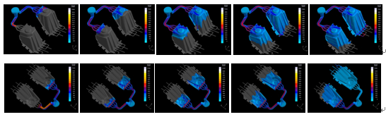 圖4:減震塔模流仿真圖 控制保溫爐中鋁液密度>2.64 g/cm3,鋁液含渣量K≤0.1。通過(guò)優(yōu)化,得到較優(yōu)熱處理參數(shù):固溶460 ℃/150 min,時(shí)效200 ℃/180 min。 Mg含量適當(dāng)降低有助于提升真空鋁合金壓鑄件的伸長(zhǎng)率,但同時(shí)會(huì)降低屈服強(qiáng)度,見(jiàn)圖4,本課題結(jié)合對(duì)強(qiáng)度性能的要求,將Mg含量將至0.3%。