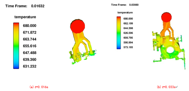 圖5:原始工藝方案 2、數(shù)值模擬與優(yōu)化 2.1 數(shù)值模擬 將原始?jí)鸿T方案導(dǎo)入FLOW-3D軟件中進(jìn)行數(shù)值模擬,圖6為原始方案流場(chǎng)分布結(jié)果。通過(guò)模擬結(jié)果可得,壓鑄件最高溫度為680 ℃,最低溫度約為603 ℃。型腔內(nèi)金屬溫度隨著與內(nèi)澆口距離的增大,其溫度大致呈逐漸降低的狀態(tài)。溫度決定凝固的順序,溫度較低的位置首先凝固,溫度較高的位置凝固較慢。充型過(guò)程較不平穩(wěn),在t=0.027 s時(shí)發(fā)生液滴飛濺現(xiàn)象。綜合分析得到,在模擬過(guò)程中,壓鑄件凝固方式為逐層凝固,并且按照遠(yuǎn)離內(nèi)澆口的方向先凝固的順序,所以能夠及時(shí)得到補(bǔ)縮,故而不會(huì)出現(xiàn)較為嚴(yán)重的縮松縮孔。