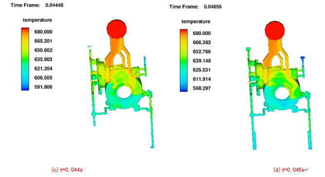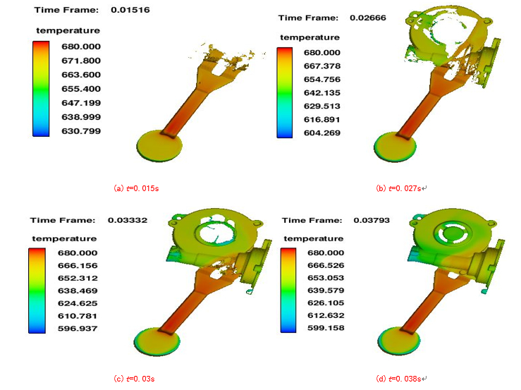 圖9:優(yōu)化方案三維圖 將優(yōu)化方案進(jìn)行數(shù)值模擬,圖10為優(yōu)化方案溫度場(chǎng)模擬結(jié)果??梢钥闯鲨T件從內(nèi)澆口開始凝固,在鑄件的充型過(guò)程中金屬液充型比較平穩(wěn),未發(fā)生金屬液飛濺的現(xiàn)象,說(shuō)明優(yōu)化方案的充型效果良好。