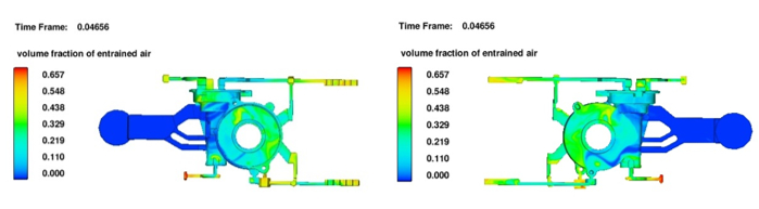 圖10:優(yōu)化方案流動(dòng)場(chǎng)模擬 圖11為優(yōu)化方案卷氣結(jié)果。從模擬結(jié)果上可以發(fā)現(xiàn),卷氣嚴(yán)重的地方集中在溢流槽和排氣槽,說(shuō)明設(shè)置的溢流槽和排氣槽起到了作用,鑄件上并未發(fā)生卷氣,進(jìn)一步表明優(yōu)化方案設(shè)計(jì)合理可行。