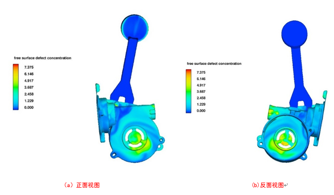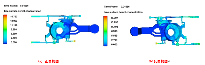 圖8:表面缺陷模擬結(jié)果及分析 2.2 工藝優(yōu)化 原始?jí)鸿T方案卷氣較嚴(yán)重,需要進(jìn)行工藝優(yōu)化,正確選擇澆口的位置和導(dǎo)流方式,對(duì)于非良形狀的鑄件多采用多股內(nèi)澆口,設(shè)置3個(gè)內(nèi)澆口,內(nèi)澆口寬度為8 mm、10 mm、20 mm。長(zhǎng)度為5 mm,增加了內(nèi)澆口截面積從而使得壓射速度提高。為了改善排氣條件,在鑄件兩側(cè)增設(shè)環(huán)形溢流槽,溢流槽1尺寸為A=5 mm,H=8 mm,B=15 mm;溢流槽2尺寸為A=10 mm,H=10 mm,B=15 mm, 溢流槽3尺寸為A=5 mm,H=8 mm,B=15 mm吊耳處增設(shè)溢流槽,尺寸為A=15 mm,H=10 mm,B=20 mm,同時(shí)設(shè)置一個(gè)圓柱形冒口,R=10 mm,H=15 mm。為了增加排氣效果,改善卷氣,在鑄件端蓋處增加排氣槽。排氣槽用于從型腔中排出空氣及涂料揮發(fā)產(chǎn)生的氣體。為了使型腔中的氣體在壓射時(shí)盡可能多的被金屬液排出,將排氣槽設(shè)置在金屬液最后填充的位置。優(yōu)化工藝的三維圖見圖9。