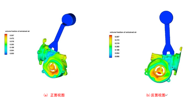 圖7:卷氣分布模擬結(jié)果 根據(jù)模擬結(jié)果來(lái)看,壓鑄件表面缺陷最高處達(dá)到7.3%左右,但處于排溢系統(tǒng)上,而鑄件主體大部分表面質(zhì)量低于2%,基本不會(huì)影響鑄件的使用。再結(jié)合圖7發(fā)現(xiàn),在表面缺陷最嚴(yán)重的位置的卷氣量也很高。因此判斷表面缺陷的產(chǎn)生和鑄件內(nèi)的卷氣量有著很大的關(guān)系。因此想要改善表面質(zhì)量,則需要從卷氣量來(lái)入手,進(jìn)行優(yōu)化方案的設(shè)計(jì)。