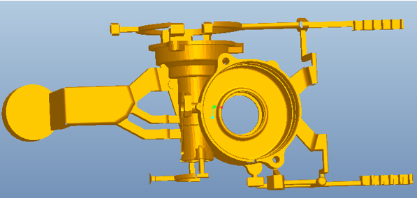 圖1:壓鑄件實(shí)體三維模型 根據(jù)分型面的選擇原則,結(jié)合研究對(duì)象的結(jié)構(gòu)特點(diǎn),分型方式見圖2。