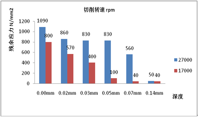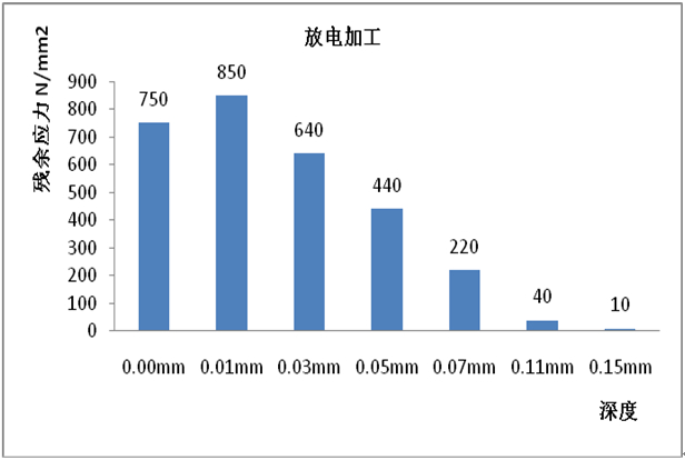 圖4:模具切削加工產生的殘余應力 對模具放電加工產生的殘余應力進行研究,得到的殘余應力數值,見圖5。原因是放電加工會在型腔產生白層,殘余應力數值較大白層深度只有0.11 mm,可以用研磨砂紙及油石手工拋光去除。