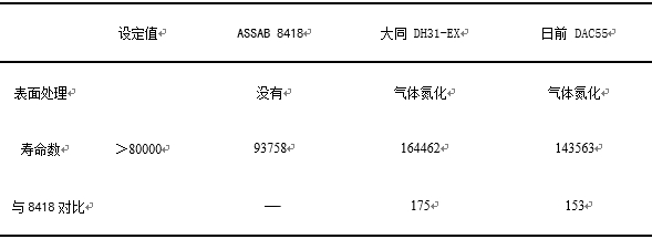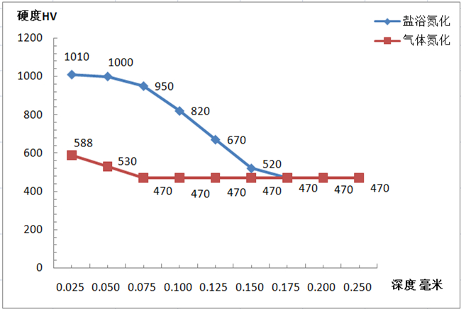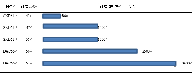 表2:兩種鋼材不同硬度出現表面龜裂紋的模次 從表1可以看出,模具鋼硬度越高,抗熱疲勞強度越高,出現表面龜裂紋的模次就越高。因為模具鋼硬度越高,韌性就越低,在模具殘余應力集中位置就容易出現大開裂。為此,試驗另一種表面處理工藝,在保證模具鋼內部韌性的前提下,提高表面硬度來提高模具鋼抗熱疲勞強度,見圖2。