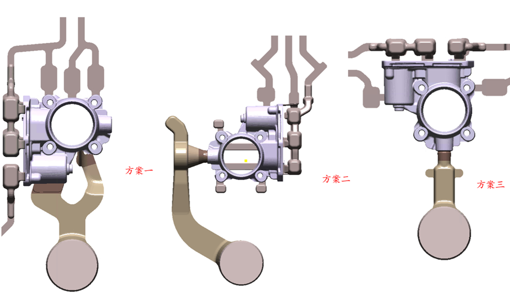 圖1:ETC節(jié)氣門鋁鑄件結(jié)構(gòu)示 2、產(chǎn)品壓鑄方案與工藝參數(shù)設(shè)計 2.1 產(chǎn)品壓鑄方案設(shè)計 壓鑄生產(chǎn)技術(shù)中極為重要的壓鑄澆口設(shè)計環(huán)節(jié),是決定著壓鑄件質(zhì)量、壓鑄生產(chǎn)效率、模具壽命、壓鑄件的切邊和清理、壓鑄合金的重熔率、壓鑄機功率的效能等方面都有著深遠的影響;因此,設(shè)計合理的澆口位置、澆口厚度與大小、澆口數(shù)量是保證壓鑄質(zhì)量合格的關(guān)鍵;從產(chǎn)品結(jié)構(gòu)特點與工藝設(shè)計經(jīng)驗分析來看,該ETC節(jié)氣門鋁殼體鑄件適合設(shè)計進料口的位置暫有三處;因此,本文將設(shè)計三個不同的壓鑄澆注方案,從理論的填充路徑和流動距離來看,不同的澆注方案會產(chǎn)生不同的填充效果,所以需基于MAGMA模擬軟件的結(jié)果進行對比分析驗證;