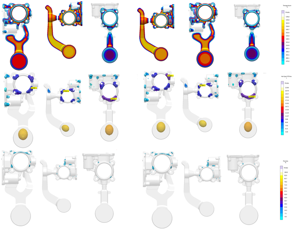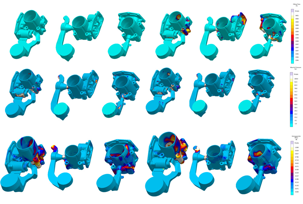 圖2:壓射方案 2.1.1 澆注方案一設(shè)計 如圖所示,澆注方案一澆口數(shù)量設(shè)計為雙股,分別設(shè)計在電機安裝位與閥板安裝位的側(cè)壁區(qū)域,選用直徑為60mm的壓射沖頭,壓射速度比為1:14;此澆注方案的優(yōu)點在于金屬液的流程相對較短,對充填過程中的溫度降低值影響較小;設(shè)計三股流道,有利于壓力的傳遞與金屬液的補縮,對減少后期生產(chǎn)過程中出現(xiàn)縮孔缺陷風險有一定的正面作用;其缺點是由于產(chǎn)品分型與結(jié)構(gòu)原因,澆道必須設(shè)計有一定的臺階位與薄壁區(qū)域,這些位置在后期的充填過程中容易出現(xiàn)包卷氣體的現(xiàn)象,并將氣體帶入型腔,后期殘留在產(chǎn)品中的可能性較大;另外,此產(chǎn)品電機安裝位不加工,澆口設(shè)計在此處,容易直接沖刷內(nèi)壁型芯,且澆口位置溫度較高,容易導致電機安裝位置出現(xiàn)拉模、沖蝕的缺陷;且澆口位置不加工,對于后期壓鑄件的切邊與清理都有一定的負面影響; 2.1.2 澆注方案二設(shè)計 如圖所示,澆注方案二澆口數(shù)量設(shè)計為一股,位置設(shè)計在閥板安裝位的側(cè)面圓孔區(qū)域,選用直徑為60mm的壓射沖頭,壓射速度比為1:30;此澆注方案的優(yōu)點是澆道可以設(shè)計的比較圓滑過渡,有利于金屬液的充填與減少充填過程中包卷氣體的現(xiàn)象,減少澆道帶入的氣體導致的缺陷;澆口設(shè)計在加工面位置,可以減少壓鑄件切邊和清理的工作量,降低生產(chǎn)成本;單股澆口,可以防止多股金屬液進入型腔后相互沖擊造成渦流、卷氣、氧化的現(xiàn)象;其缺點是對于澆口遠端的熱節(jié)位置的補縮作用基本缺失,需考慮其他的輔助補縮方案;且金屬液的流程相對較長,對充填過程中的金屬液溫度有一定的負面影響,局部位置可能出現(xiàn)冷料缺陷; 2.1.3 澆注方案三設(shè)計 如圖所示,澆注方案三澆口數(shù)量設(shè)計為一股,位置設(shè)置在閥板安裝位的側(cè)面圓孔區(qū)域,選用直徑為60mm的壓射沖頭,壓射速度比為1:30;此澆道的優(yōu)點是澆口設(shè)計在加工面位置,可以減少壓鑄機切邊與清理的工作量,降低生產(chǎn)成本,澆道設(shè)計為直線充填的樣式,可以使鋁液充填行程減少,鋁液的溫度損失量減少;沖頭與澆口距離短,可以保證沖頭壓力的有效傳遞;其缺點是后期生產(chǎn)調(diào)節(jié)參數(shù)的靈活性較差,無法通過調(diào)整壓鑄參數(shù)改善產(chǎn)品質(zhì)量。 2.2 產(chǎn)品工藝參數(shù)方案設(shè)計 根據(jù)對ETC節(jié)氣門鋁殼體鑄件的結(jié)構(gòu)分析與質(zhì)量要求,此產(chǎn)品選用350T壓鑄機,一模一腔設(shè)計,鑄造壓力設(shè)置為100MPa,保證有足夠的補縮效率,減少后期縮孔缺陷的出現(xiàn);澆注溫度設(shè)計為660-680℃,動定模芯預熱至180-200℃;充填時低速設(shè)置為0.25m/s,高速速度設(shè)置為3m/s,高速切換點分別測試340mm與350mm兩個位置,以此確定出金屬液最平穩(wěn)的充填狀態(tài)和最少渦流與卷氣的現(xiàn)象;同時采用線冷加點冷的溫控系統(tǒng),保證模具的熱平衡狀態(tài)良好; 3、一鍵式導入的數(shù)值模擬與對比分析 鑄件的充填與凝固過程控制對壓鑄件的質(zhì)量有著決定性影響,但由于這兩個過程在生產(chǎn)過程中都是在密閉不可見的型腔中完成,無法直接或間接觀測與分析,因此前期的數(shù)值模擬就尤為重要;通過使用邁格碼DOE功能,一鍵式導入上述三種壓射方案與兩個測試高速切換位置,一次性計算出多種方案,最快速預測出缺陷位置,找出最佳方案,提升產(chǎn)品內(nèi)部質(zhì)量,減少開發(fā)周期,降低生產(chǎn)成本。 3.1 充填過程模擬與分析 如圖3所示,圖片第一排模擬結(jié)果為充型時間,前三個方案的高速切換位置為340mm,充型時間短,后三個方案的高速切換位置為350mm,充型時間長,同時亮色位置為三種壓射方案最后充型的位置; 圖片第二排結(jié)果為最大氣壓結(jié)果,模擬結(jié)果亮色處為高氣壓位置,氣孔風險大。通過對比發(fā)現(xiàn),方案二與方案五氣壓值相對較低,氣孔風險相對較小; 圖片第三排結(jié)果為充型卷氣結(jié)果,模擬結(jié)果亮色位置含氣量高,泄露風險性大。通過對比發(fā)現(xiàn),方案二與方案五卷氣值相對較低,泄露風險相對較小; 綜合充型過程模擬結(jié)果分析,方案二與方案五的氣壓與卷氣相對較低,而方案二高速切換位置靠前,充型時間短,所以整體成型性良好。