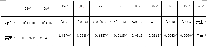 表2:AlSi9Cu3合金的力學性能 1.1.2 試驗用Al-Ti-B細化劑化學成分 選擇試驗用Al-Ti-B細化劑為Al-5Ti-1B,其成分見表3,在A化學成分穩定一致情況下進行試驗。