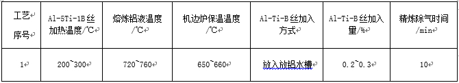 表3:Al-5Ti-1B絲化學成分 wb/% 1.2 Al-5Ti-1B細化劑的添加工藝要求 根據生產車間壓鑄現場熔化工藝,壓鑄工藝,以及Al-5Ti-1B絲對于溫度的要求,添加工序及添加方式的有關條件進行統一,保證試驗過程穩定,見表4。