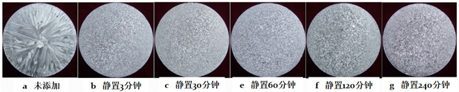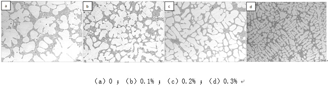 表4:主要熔煉鑄造工藝參數 2、添加Al-Ti-B細化劑及保溫時間對鋁合金組織的影響 鋁合金在金相下通常有3種晶粒形態,分別是柱狀晶、等軸晶和細晶組織。柱狀晶嚴重影響材料的強度和韌性,細小的等軸晶會降低熱裂紋傾向,但粗大的等軸晶也會降低材料的力學性能。在鋁合金壓鑄過程中,都會產生下腳料,下腳料都會作為回爐料按照一定的比例進行重熔后再次使用,在反復重熔的過程中,會造成鋁合金液的質量下降,影響合金的力學性能。因此,通過添加Al-5Ti-1B細化劑,細化組織,改善鋁液質量。通過添加Al-5Ti-1B細化劑后,鋁合金液保溫時間對其衰退效果的對比最終確定最佳的變質時間。 2.1 Al-5Ti-1B細化劑添加前后對比 對添加Al-Ti-B細化劑前后的鋁合金液進行取樣對比分析,見圖1。可以看出,添加Al-5Ti-1B細化劑的試樣內部組織比較細小,而未添加Al-Ti-B細化劑的晶粒相對比較粗大。而且隨著添加量增加,晶粒尺寸進一步細化。