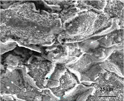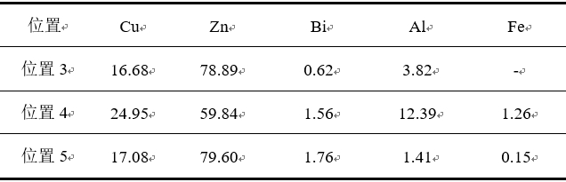 表2:鉍黃銅閥體零件存在貫穿裂紋處斷面的化學成分wb/% 2.2 鉍黃銅閥體零件存在貫穿裂紋處斷面的微觀形貌和微區成分 使用掃描電鏡對鉍黃銅閥體零件存在貫穿裂紋處的斷面進行觀測,其微觀形貌見圖3。在圖3中選擇3個點進行微區成分分析,結果表3。由3點的微區成分可見,閥體零件在存在裂紋處的斷面上,Bi元素的分布也不均勻,而且存在富鋅的區域和一些含有Al元素和Fe元素的相,在鉍黃銅中加入少量的Al可改善合金的鑄造性能,添加少量的Fe元素可以提高合金的強度。
