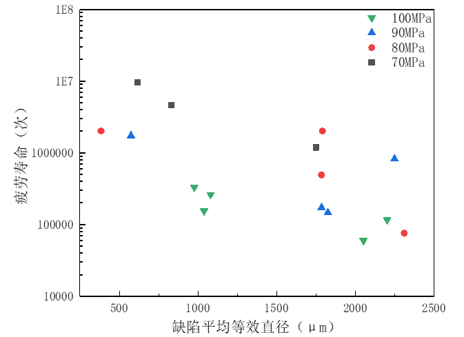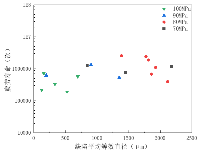 圖8:半固態壓鑄試樣裂紋源缺陷平均等效直徑VS疲勞壽命 兩批試樣的疲勞壽命與裂紋源缺陷尺寸的關系見圖7和圖8??梢钥闯?,液態壓鑄試樣表現為裂紋源缺陷的尺寸越小,試樣的疲勞性能越好,而半固態壓鑄試樣隨缺陷尺寸的變化規律卻不明顯。僅在80MPa 應力級上表現為缺陷尺寸越小,試樣的疲勞性能越好。